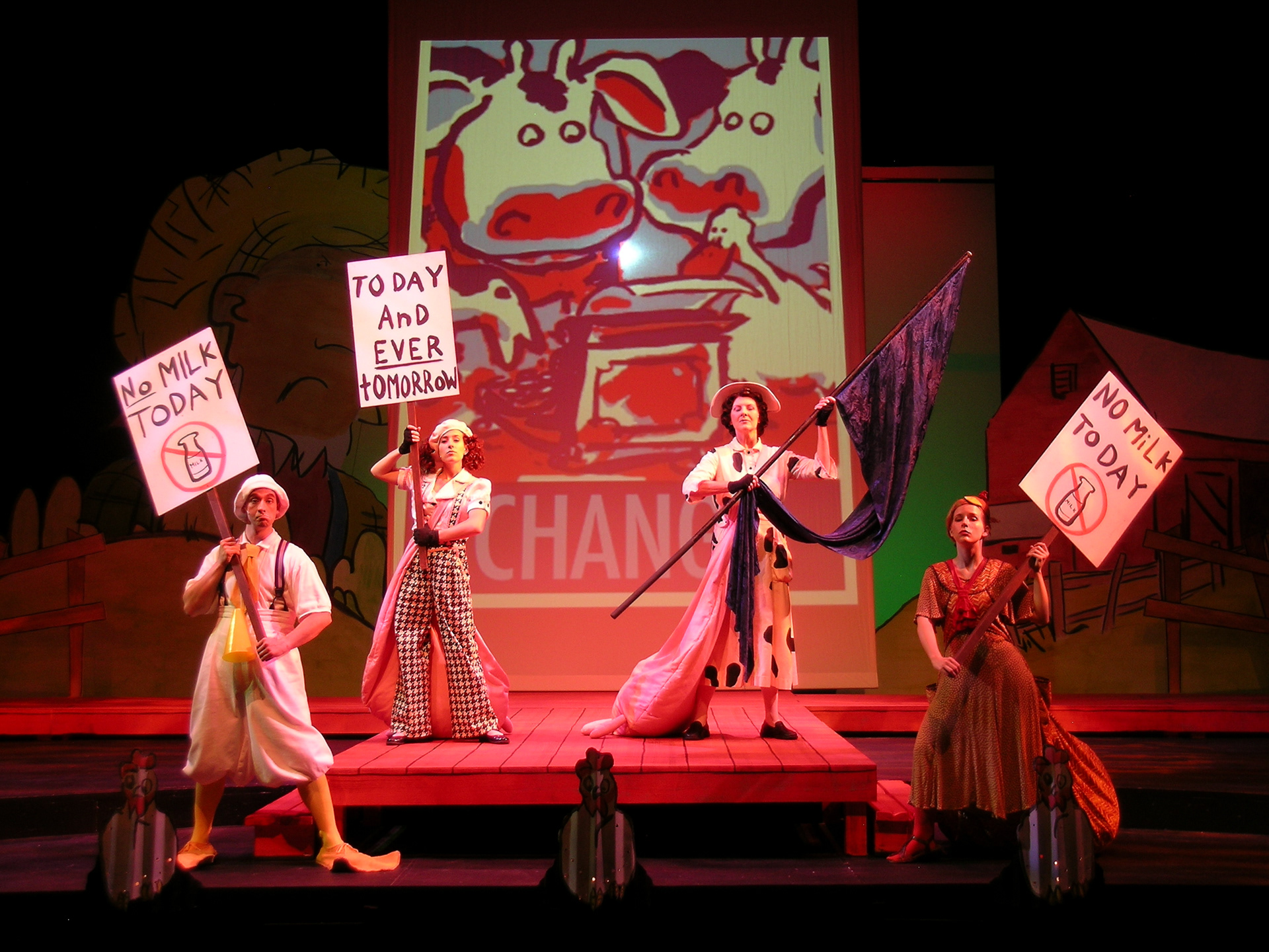 "Click, Clack, Moo: Cows That Type" a fun storybook put to life onstage. The director wanted to see the Cow's notes typed out in real time and the hand-written notes back from the Farmer as well. Additionally, 'protest imagery' was needed to help support the farm animal rally. The images were rear projected. The projector was mounted vertically on a fly, that was flown into position in conjunction with the projection surface.