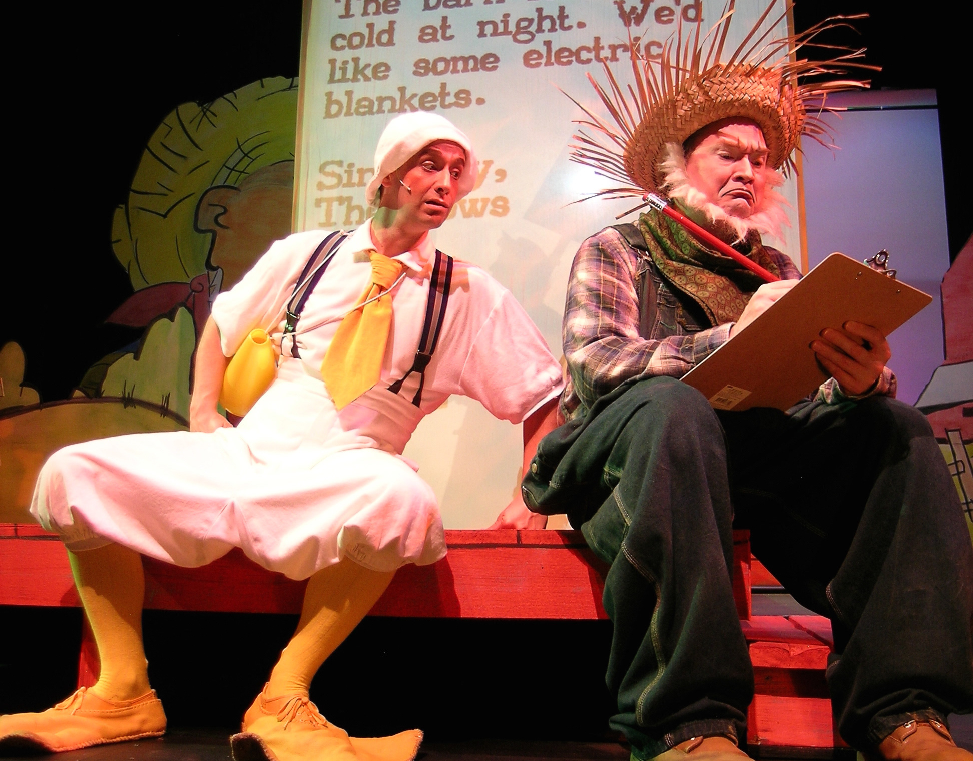 Projected animated imagery from the book, "Go, Dog. Go!" by P.D. Eastman. The images were used to support some of the theatrical elements of the show--filling out the world of the dogs with environmental images and full action sequences. Projected from the front, behind the proscenium onto the white back wall of the theatre.